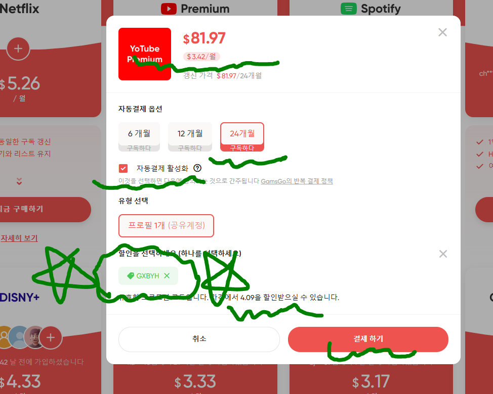 겜스고에서 유튜브 프리미엄을 구독할 때, 결제 단계에서 프로모션 코드나 쿠폰 입력란에 GXBYH를 입력하면 추가로 3~5%의 할인을 받을 수 있어요.